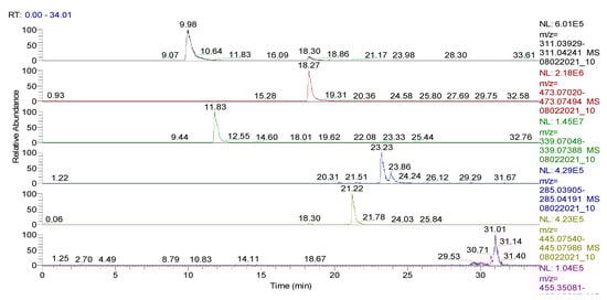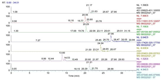 UHPLC–HRMS/MS chromatogram for CE in which were identified (top to bottom): vitexin (m/z: 431.09839, Rt: 21.17), 1,5-dicaffeoylquinic acid (m/z: 515.11949, Rt: 20.06), kaempherol (luteolin)-O-glucoside (m/z: 447.09331, Rt: 20.29), carnosol (m/z: 329.17585, Rt: 27.06), hispidulin (m/z: 299.05613, Rt: 24.24), chlorogenic/neochlorogenic acid (m/z: 353.08783, Rt: 10.44/13.80), and apigenin-7-O-glucuronide (m/z: 445.07763, Rt: 21.21).