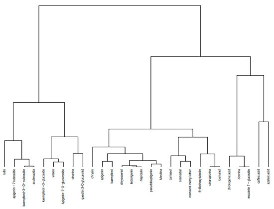 The artichoke extract composition’s dendrogram (Figure 2) shows the disposition of the identified compounds in four clusters. The first cluster contains a group of 9 compounds of the flavonoid class, the second one contains a group of 14 compounds represented by flavonoid aglycones (in this group there are 2 diterpene derivatives—carnosol and rosmanol, and 1 sesquiterpene compound—cynaropicrin), the third one contains a group of phenolic compounds such as chlorogenic acid and 2 coumarin derivatives, and the last one contains 2 phenolic acids—caffeic and azelaic acid.
