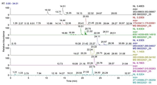 UHPLC–HRMS/MS chromatogram for RE in which were identified (top to bottom): chlorogenic acid (m/z: 353.08783, Rt: 10.32/14.51), caffeic acid/isomers (m/z: 179.03501, Rt: 14.44/20.93), rutin (m/z: 609.14613, Rt: 19.51), apigenin (m/z: 269.04502, Rt: 24.11), kaempferol (m/z: 285.04049, Rt: 23.22), naringenin (m/z: 271.06122, Rt: 22.73).