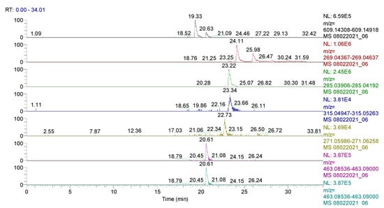 UHPLC–HRMS/MS chromatogram of TE in which were identified (top to bottom): rutin (m/z: 609.14613, Rt: 19.33), apigenin/genistein (m/z: 269.04502, Rt: 24.11), kaempherol (m/z: 285.04049, Rt: 23.22), naringenin (m/z: 271.06122, Rt: 22.73), and hyperoside (m/z: 463.08768, Rt: 20.61).