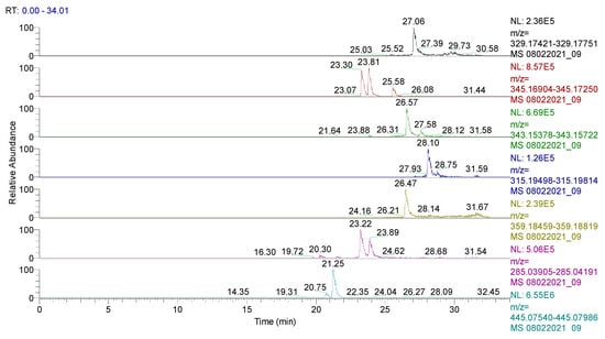 UHPLC–HRMS/MS chromatogram for AE in which were identified (top to bottom): carnosol (m/z: 329.17585, Rt: 27.06), rosmanol/epirosmanol (m/z: 345.17077, Rt: 23.07/23.81), rosmadial (m/z: 343.15509, Rt: 26.57), rosmaridiphenol (m/z: 315.19656, Rt: 28.10), rosmanol methyl ether (m/z: 359.18639, Rt: 26.47), luteolin (m/z: 285.04048, Rt: 23.22/23.89), and apigenin-7-O-glucuronide (m/z: 445.07763, Rt: 21.25).