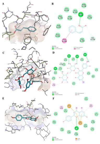 The predicted molecular interactions are further discussed for the top scoring phytochemicals on each target. We chose to comment on the interactions between CYP2E1 and cinnamic acid since this particular compound showed a strikingly high ligand efficiency. Cinnamic acid is involved in hydrogen bonding with Asn206 through its carboxylic moiety. The protein–ligand complex is further stabilized by a carbon–hydrogen bond with Val239, pi–pi stacked interactions with Phe298, and van der Waals interactions with nine other residues within the active site (Figure 8A,B).