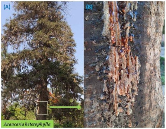 Parallel studies demonstrated that the Araucariaceae family including A. heterophylla, produces several monoterpenes, such as pinene, camphene, and limonene as common compounds [78]. Araucaria spp. contains various sesquiterpenes like humulanes, cadinanes, caryophyllanes, and other compounds [79]. The resin of Araucaria columnaris is rich in aromadendrene and bicyclogermacrene and contains sesquiterpene hydrocarbons and oxygenated sesquiterpenes [80,81]. Similar studies indicated that A. heterophylla contained flavonoids, sesqui and di-terpenes, and phenylpropanoids [81]; two monoterpene resins, b-pinene and a-pinene, were commonly found in wood found in Araucaria angustifolia and such compounds were detected in Norway spruce with many monoterpenoids in wood and bark [82].