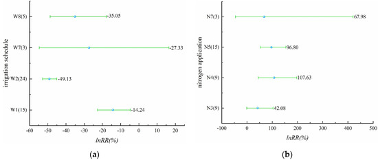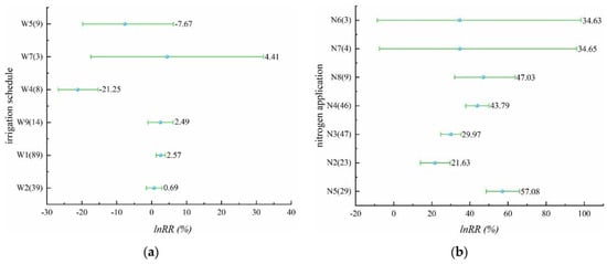 From Figure 8a (Table S13) we can see that alternate wet and dry, controlled irrigation, shallow irrigation and deep storage, and thin and wet irrigation were involved in this part. All four irrigation schedules reduced nitrogen leaching from the rice field. Alternate wet and dry, controlled irrigation, and thin and wet irrigation had significant effects, and the effect of controlled irrigation on the reduction of nitrogen leaching reached 49.13%. The reduction effect of shallow irrigation and deep storage on nitrogen leaching from paddy fields was not significant. There were four levels of nitrogen application, N3, N4, N5, and N7, and nitrogen leaching was increased by all four levels of nitrogen application (Figure 8b, Table S14). N4 and N5 increased nitrogen leaching significantly. For the effect of increasing nitrogen leaching, N4 was 1.08 times higher than N0. N3 and N7 showed a non-significant increase in nitrogen leaching. This phenomenon may be due to the lack of abundance of sample points. In addition, comparing different irrigation schedules, water-saving irrigation could reduce nitrogen leaching losses, while different levels of nitrogen application caused an increase in nitrogen leaching losses.