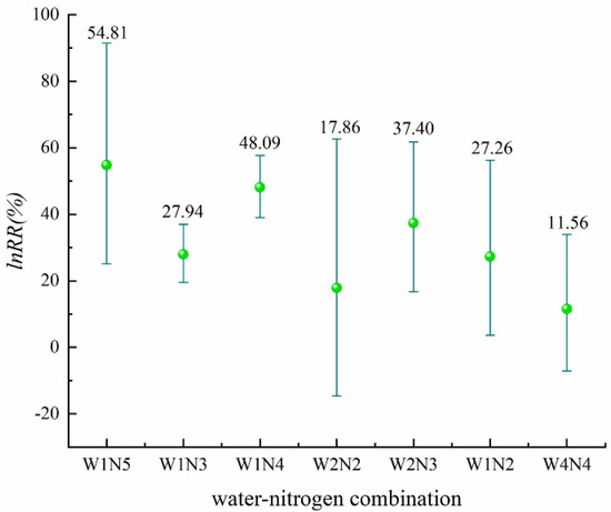 Seven water and nitrogen combinations are shown in Figure 2 (Table S3); all seven water and nitrogen combinations resulted in an increasing yield of rice. The yield-increasing effect of alternating wet and dry irrigation coupled with four different nitrogen application levels (W1N2, W1N3, W1N4, and W1N5) was significant, and W1N5 had the largest value of 54.81%. The yield increase effect was not significant for two water–nitrogen combinations, W2N2 and W4N4, and among the water–nitrogen combinations, W4N4 had the lowest average yield-increasing effect of 11.56%.