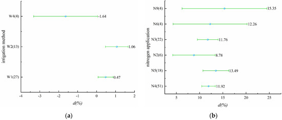 Three different irrigation schedules were included in this part, namely alternate wet and dry, controlled irrigation, and dry cultivation (Figure 3a, Table S4). Alternate wet and dry and controlled irrigation can improve nitrogen use efficiency, while dry cultivation had a decreasing effect on nitrogen use efficiency with a mean value of 1.64%, but it is non-significant. Similarly, all six nitrogen application levels (N2~N6, N9) improve nitrogen use efficiency (Figure 3b, Table S5), among which the average effect of N9 on improving nitrogen use efficiency was the largest, reaching 15.35%. It is worth noting that, except for N9, the relationship between yield and nitrogen use efficiency under nitrogen applications was similar.