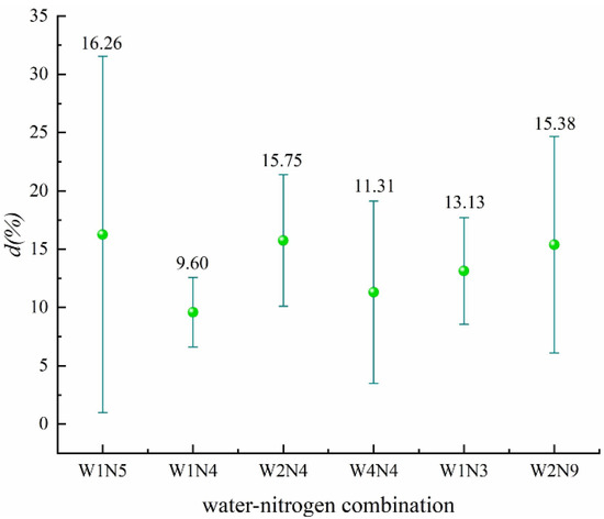 From Figure 6 (Table S9), where we can see the five water–nitrogen combinations, it can be observed that the effect of the five water–nitrogen combinations on increasing N2O emissions is significant, among which W2N2 has the smallest N2O emissions, its average effect value being 76.03%. The effect of water–nitrogen coupling on N2O emissions is more significant.