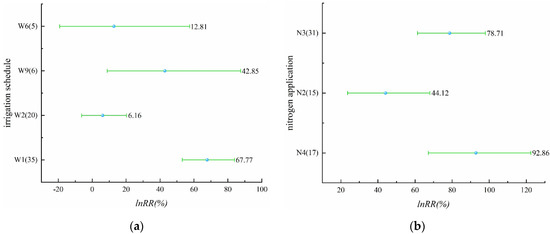 In this paper, a meta-analysis was conducted using MetaWin software, with lnRR (response ratio) as the effect size [48], as a response to the effect of different irrigation schedules compared to conventional irrigation on rice yield, N2O emissions, nitrogen runoff, nitrogen leakage, and ammonia volatilization. In the case of nitrogen application grouping, the response is the effect of different nitrogen application levels compared to no nitrogen application on yield and other data, and all equations in this section are illustrated in terms of yield.