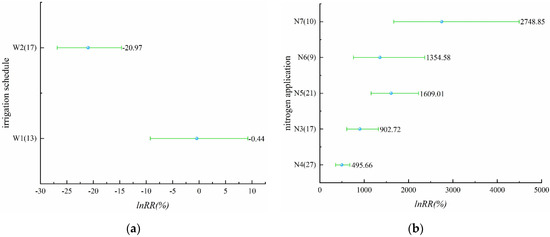 In the study on the effect of irrigation schedules on rice yield, there were four different irrigation schedules with yield-increasing effects, including alternate wet and dry irrigation, controlled irrigation, shallow irrigation and deep storage, and shallow alternate wet and dry in Figure 1a (Table S1). The yield-increasing effect of alternate wet and dry irrigation was significant with a mean value of 2.57%, while the yield-increasing effect of controlled irrigation, shallow irrigation and deep storage, and shallow alternate wet and dry was not significant. The irrigation schedules with yield-reducing effects were dry cultivation and moist irrigation, and the yield-reducing effect of dry cultivation was significant, reaching 21.25%, while the yield-reducing effect of moist irrigation was not significant. The effect values of all five irrigation schedules, except dry cultivation on yield, did not exceed 10%, indicating that the effect of these five irrigation schedules on yield was not significant. For nitrogen application levels that involve N2–N8 in Figure 1b (Table S2), all seven nitrogen application levels had yield-increasing effects, among which N6 and N7 had insignificant yield-increasing effects, and the remaining several nitrogen application levels had significant yield-increasing effects, which may be due to the insufficient sample size of N6 and N7. N5 had 200–250 kg/ha of applied nitrogen. It is noteworthy that the effect of rice yield increase becomes more significant as the applied nitrogen increases, but when the applied nitrogen reaches a certain level (N5), the effect of yield increase will start to decrease. Compared with the effect of different irrigation schedules on rice yield, the effect of nitrogen application on yield is more significant.