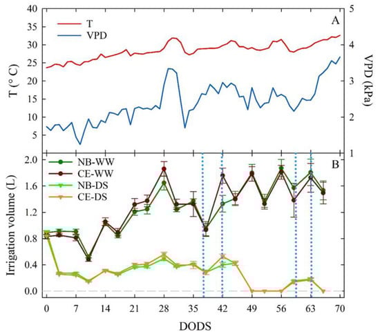 Average daily T values ranged between 24 and 34 °C from 0 to 70 DODS, with an increase at 28 DODS (end of June) and a decrease at 33 DODS (early July) (Figure 1A). T increased in the last seven days of the experiment and reached its maximum value on the last recorded day. VPD values fluctuated throughout the experiment, from 0.2 kPa, after the first week, to 3.7 kPa at the end of the trial. A peak of VPD was registered at 30 DODS, driven by a rise in T. As with T, a steady increase in VPD was seen in the last seven days of the trial (Figure 1A).