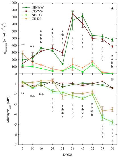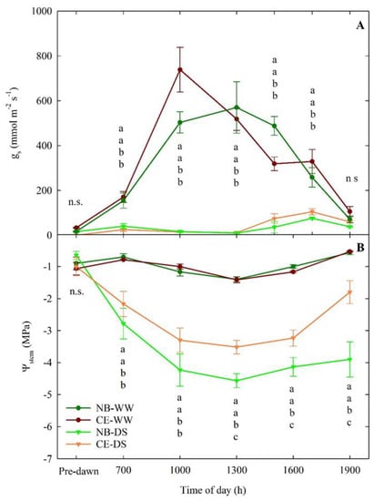 The daily patterns of gs at the end of drought (66 DODS) showed markedly significant differences between WW and DS, regardless of the cultivar (Figure 3A). CE-WW plants showed an expected gs peak at mid-morning, followed by a steady decrease in conductance until 1900 h. NB-WW did not have a clearly defined peak of gs, and its pattern followed a bell-like shape, with the highest gs occurring between 1000 and 1500 h. Nevertheless, there were no significant differences between the NB-WW and CE-WW. Similarly, NB-DS and CE-DS did not significantly differ at any of the six measurement times (Figure 3A). In both NB-DS and CE-DS, gs was near zero the entire day but there was a tendency to have slightly higher stomatal aperture in the afternoon (1500–1700 h), in line with previous observations in NB [42].