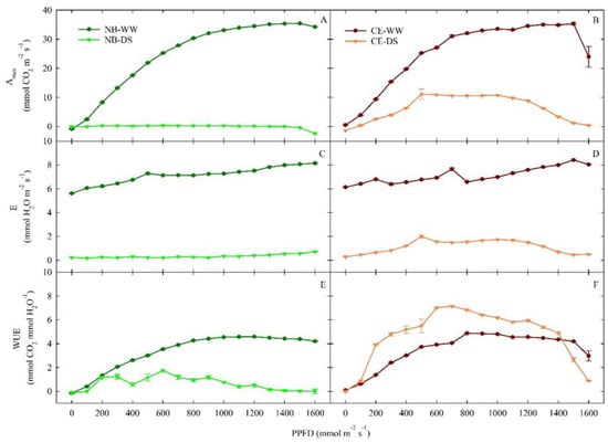 Responses of photosynthetic capacity (Amax, (A,B)), transpiration (C–E), and water use efficiency (WUE, (E,F)) to changes in photosynthetic photon flux density (PPFD) in well-watered and drought-stressed ‘Nocellara del Belice’ (NB-WW and NB-DS, respectively) and ‘Cerasuola’ (CE-WW and CE-DS, respectively) olive trees on the 59th day of drought stress. Error bars indicate the standard errors of the means.