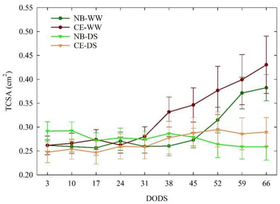 During the experiment, no significant differences in TCSA were detected between CE-WW and NB-WW trees (Figure 5). The TCSA of CE-WW did not show significant changes in size in the first 24 DODS and then increased almost linearly until 66 DODS, whereas in NB-WW, TCSA started to increase at 45 DODS. The TCSA of both NB-DS and CE-DS remained in the 0.24–0.30 cm2 range throughout the experiment. Significant differences between the TCSA of well-watered and drought-stressed plants only appeared at 59 and 66 DODS, with NB-WW and CE-WW being significantly higher than CE-DS and NB-DS.