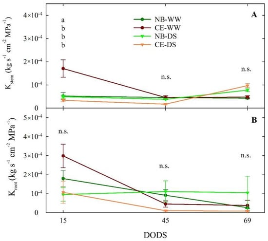 Stem sapwood−specific hydraulic conductance (Kstem, (A)) and root sapwood-specific hydraulic conductance (Kroot, (B)) measured at 15, 45, and 69 days of drought stress (DODS) in well-watered and drought-stressed ‘Nocellara del Belice’ (NB-WW and NB-DS, respectively) and ‘Cerasuola’ (CE-WW and CE-DS, respectively) olive trees. Error bars indicate the standard errors of the means. For each day, different letters indicate significant differences between treatments according to the Tukey’s test following analysis of variance (p < 0.05).