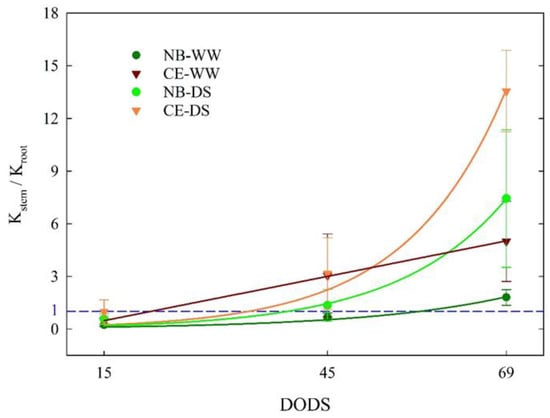 At 15 DODS, Kstem/Kroot values were between 0 and 1 in all the cultivar × irrigation treatment combinations (Figure 7), indicating that, at the beginning of the drought, the highest conductance was observed in roots as opposed to stems. With time and drought intensity, Kstem became higher than Kroot regardless of the cultivar × irrigation treatment combination. The increase in Kstem/Kroot in WW treatments might have been driven by a greenhouse environment with an increasing VPD (Figure 1). The growth of Kstem/Kroot from 15 to 69 DODS followed exponential trends, except for CE-WW, which followed a linear trend (Figure 7). The curvature of the exponential fits was more prominent in DS than in WW trees, with CE-DS reaching the highest ratio. These findings show that increasing the Kstem/Kroot ratio is an important mechanism that both cultivars, but more markedly CE, used as a drought avoidance strategy, and not only was this strategy deployed under drought conditions, but was also triggered in WW plants under warmer and drier environments such as those experienced by plants from 45 to 69 DODS.
