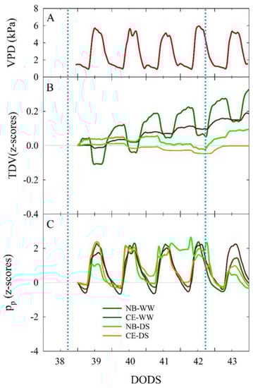 Vapor pressure deficit (VPD, (A)) and standardized (z-scores) of trunk diameter variations (TDV, (B)) and attenuated pressure of leaf patches (pp, (C)) trends in well-watered and drought-stressed ‘Nocellara del Belice’ (NB-WW and NB-DS, respectively) and ‘Cerasuola’ (CE-WW and CE-DS, respectively) olive trees. Trends reported in the time interval between 39 and 43 days of drought stress (DODS). Light blue dotted lines indicate irrigation events.