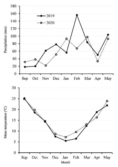 Precipitation and mean temperature during rapeseed growth season in 2018–2019 and 2019–2020.