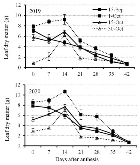 Leaf dry matter accumulation from anthesis with a 7 d interval under four planting dates—early, optimal, late, and very late (15 September, 1 October, 15 October, and 30 October, respectively)—in 2019 and 2020. Bars of each value are standard error.