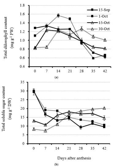 Leaf total chlorophyll (a) and total carbohydrate (b) content accumulation from anthesis with a 7 d interval under four planting dates—early, optimal, late, and very late (15 September, 1 October, 15 October, and 30 October, respectively)—in 2020. Bars of each value are standard error.