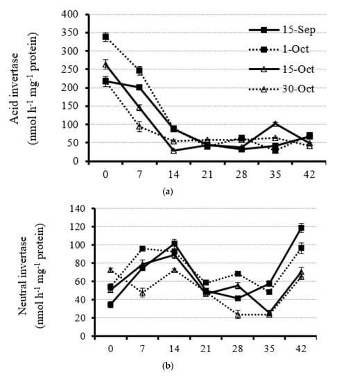 Leaf AI activity under all planting dates decreased sharply from the initial anthesis to 14 DAA (Figure 4a and Supplementary Figure S3). The leaf AI activity was very low from 14 DAA on, which was reduced by 50% to 75% compared with 0 DAA, and kept rather stable (Figure 4a and Supplementary Figure S3). The result suggested that the AI in rapeseed leaves mainly functioned at the early reproductive stage (0 to 14 DAA) to catalyze sucrose. As for the influence of planting date on leaf AI activity, leaf AI activity markedly decreased when rapeseed plants were planted under late and very late dates at the early reproductive stage (from 0 to 14 DAA). For example, the average leaf AI activity at the beginning of flowering under the optimal planting date (1 October) was 30% and 38% higher than that at the late and very late planting dates (15 October and 30 October), respectively (Figure 4a and Supplementary Figure S3).