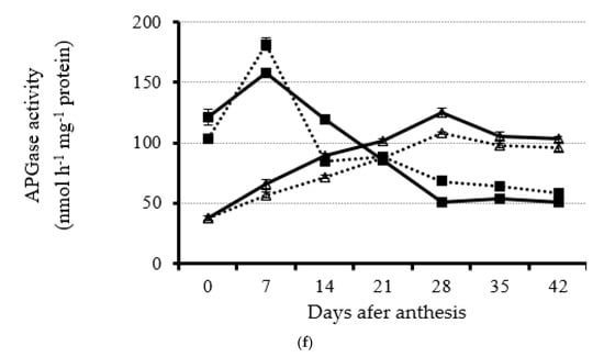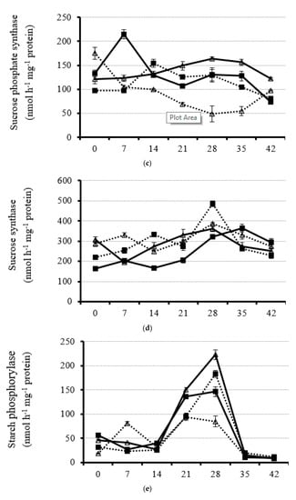 Invertase, SUS, and sucrose phosphate synthase (SPS) extraction and determination were performed using the method described by King et al. [37]. Starch phosphorylase (SS) and ADP-glucose pyrophosphorylase (AGPase) activities were measured according to the method of Smith [38], Smith et al. [39], and da Silva [40].