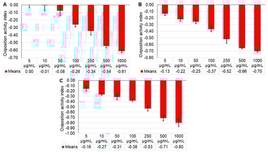Ovipositional activity index (mean ± standard error) for Oligonychus punicae in response to different concentrations of Magnolia tamaulipana ethanolic powdered extract at (A) 24 h, (B) 48 h, and (C) 72 h.