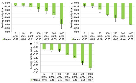 Feeding activity index (mean ± standard error) for Oligonychus punicae in response to different concentrations of Magnolia tamaulipana ethanolic powdered extract at (A) 24 h, (B) 48 h, and (C) 72 h.