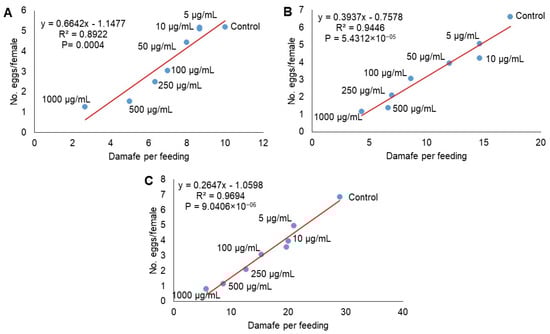 The correlation between the number of eggs laid per female and percentage of feeding damage of Oligonychus punicae treated with different concentrations of ethanolic powdered extract of Magnolia tamaulipana leaves at 24 h (A), 48 h (B), and 72 h (C).