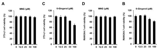 Effect of MNG on the viability of 3T3-L1 preadipocytes and RAW264.7 cells. Effect of (A) MNG and (B) 6-gingerol (positive control) compared with the control (untreated, 0 μM) on the viability of 3T3-L1 preadipocytes for 24 h. Effect of (C) MNG and (D) 6-gingerol compared with the control (0 μM) on the viability of RAW264.7 cells for 24 h. Cell viability was determined using MTT assay (n = 3 independent experiments, p > 0.05, Kruskal–Wallis nonparametric test). Data represent the mean ± SEM.