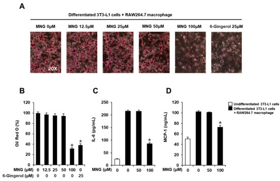Inhibitory effects of the MNG on lipid accumulation and production of IL-6 and MCP-1 in co-culture conditions with 3T3-L1 and RAW264.7 cells. (A) Images of Oil Red O staining representing lipid accumulation and (B) levels of Oil Red O staining in co-culture condition with 3T3-L1 and RAW264.7 cells treated with the indicated concentration of MNG and 6-gingerol (positive control). Analysis of levels of the proinflammatory cytokine (C) IL-6 and (D) MCP-1 in co-culture conditions with 3T3-L1 and RAW264.7 cells treated with the indicated concentration of MNG and 6-gingerol (n = 3 independent experiments, * p < 0.05, Kruskal–Wallis nonparametric test). Data represent the mean ± SEM.