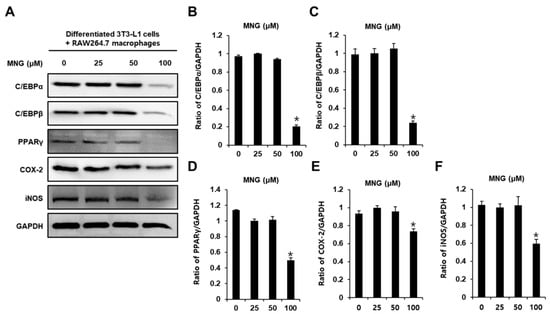 Inhibitory effects of MNG on adipogenesis- and inflammation-associated proteins in co-culture condition with 3T3-L1 and RAW264.7 cells. (A) Protein expression of CCAAT/enhancer-binding protein alpha (C/EBPα), C/EBPβ, peroxisome proliferator-activated receptor γ (PPARγ), cyclooxygenase 2 (COX-2), and inducible nitric oxide synthase (iNOS) in co-culture condition with 3T3-L1 and RAW264.7 cells treated with the indicated concentration of MNG. (B–F) Analysis of ratios of band intensities of C/EBPα, C/EBPβ, PPARγ, COX-2, and iNOS. (n = 3 independent experiments, * p < 0.05, Kruskal–Wallis nonparametric test). Data represent the mean ± SEM.