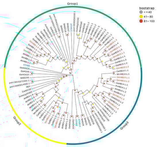 Phylogenetic tree of full-length HD-Zip III proteins from soybean, chickpea, peanut, kidney bean, medicago, wild soybean, strawberry, cucumber, poplar, tomato, rice, and Arabidopsis. The 90 HD-Zip III proteins from 13 plant species can be divided into three groups. The words marked in blue are Arabidopsis HD-Zip III proteins, and those marked in red are GmHD-Zip III proteins. The colors of the circles indicate physical distances: gray represents long distances, and red means short distances.