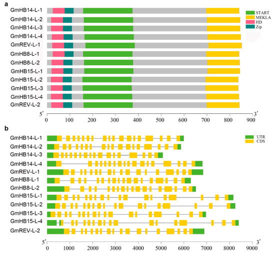 All of the 12 GmHD-Zip III proteins contained four highly conserved domains (Figure 2a), namely, START, MEKHLA, HD, and Zip. The closely related HD and Zip domains are the structural basis of this family of proteins, which together determine their functions as transcription factors. The START domain was predicted to be a lipid or steroid-binding receptor that can bind to small hydrophobic molecules, such as phospholipids and steroids, and is highly conserved in evolution [28]. The HD-Zip III family genes also contain an additional highly conserved MEKHLA domain. The MEKHLA domain is unique to the HD-Zip III family [29]. However, studies on the potential role of the MEKHLA domain in plants are limited. The MEKHLA domain shares high similarity with the Per-Arnt-Sim (PAS) domain [30]. The PAS domain might have originated from algae, and may be involved in the regulation of light signals received by plants and related to photosynthesis [31].