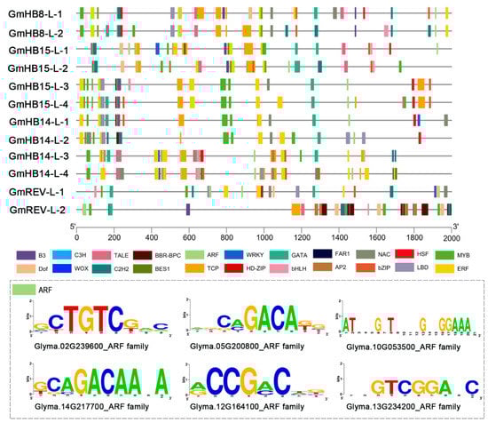 cis-Acting elements play an important role in modulating the molecular switches of dynamic transcriptional regulation in response to developmental processes and hormonal signaling [32]. On the basis of their functions, the cis-acting elements were grouped into several classes: stress, development, and hormone-responsive elements (Table S4, Figure S4). All soybean HD-Zip III genes contained ARF elements, which are putative binding sites for auxin response factor (ARF/MP) proteins [33]. ARF proteins may bind ARF elements to activate or repress transcription of GmHD-Zip III genes (Figure 3).