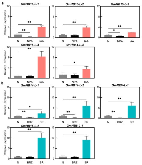 (a) Expression profiles of GmHD-Zip III genes under IAA and NPA. (b) Expression profiles of GmHD-Zip III genes under BR and BRZ.Asterisks indicate significant differences between controls and treatments (* p < 0.05, ** p < 0.01).