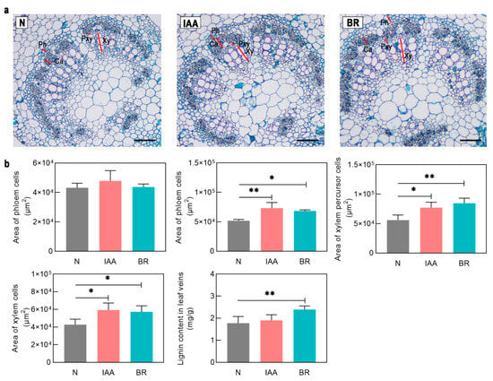 (a) The anatomy of the leaf veins. Ca, cambium cell; Ph, phloem cell; TE, tracheary cell; Pxy, xylem precursor cell. All black scale bars indicate 100 μm. (b) Phenotypic analysis of soybean leaf veins under IAA and BR treatment. Asterisks indicate significant differences between controls and treatments (* p < 0.05, ** p < 0.01).