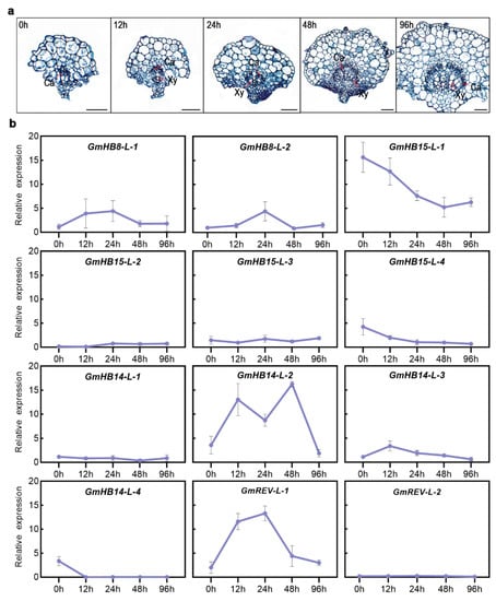 We analyzed the changes in the gene expression of GmHD-Zip III in samples obtained at different leaf vein developmental stages to understand the possible functions of GmHD-Zip III genes in leaf vein development in soybean. Figure 6a shows the transverse sections of leaf veins taken at five different soybean developmental stages. The results revealed that GmHB15-L-1 and GmREV-L-1 were very specifically expressed in vascular tissues at all stages, including the 0, 12, 24, 48, and 96 h stages, of vascular maturation (Figure 6a). GmHB15-L-1 was the earliest expressed gene in leaf vein development (Figure 5b). The first group genes (GmHB15-L-1, 4) exhibited similar expression patterns. As the leaf vein developed, the relative expression levels of the two genes gradually decreased. GmREV-L-1 and GmHB14-L-2 transcripts steadily accumulated during 12 to 48 h of development. As shown in Figure 6a, these time points corresponded to key xylem developmental stages. Subsequently, we examined gene expression in the cambium and the developing xylem and phloem. GmHB15-L-1 was expressed at low levels in the developing xylem and phloem but was highly expressed in the vascular cambium (Figure 7). GmREV-L-1 and GmHB14-L-2 were expressed at low levels in the developing phloem but expressed at high levels in the vascular cambium and xylem (Figure 7). The distinctive expression patterns of these genes in leaf veins imply their functional diversity in association with vascular development. These results suggest that GmHB15-L-1, GmREV-L-1, and GmHB14-L-2 play essential roles in leaf vein development.