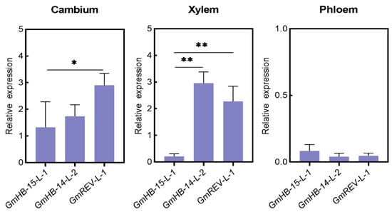 Expression of soybean HD-Zip III genes in various types of vascular cells. Asterisks indicate significant differences between controls and treatments (* p < 0.05, ** p < 0.01).