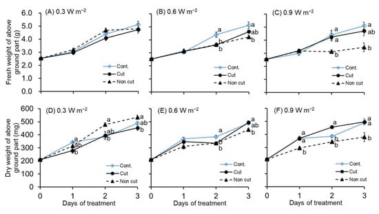 However, the dry weight of the aboveground part significantly decreased, even at the 0.3 W m−2 treatment. In the 0.6 W m−2 treatment, the dry weight showed a significant decrease in both UV treatments (i.e., cut and non-cut) from 2 days of treatment, as in the fresh weight result. In the 0.9 W m−2 treatment, a significant decrease was observed in the non-cut treatment from 1 day of treatment, and a significant decrease was also observed in the cut treatment from 2 days of treatment.