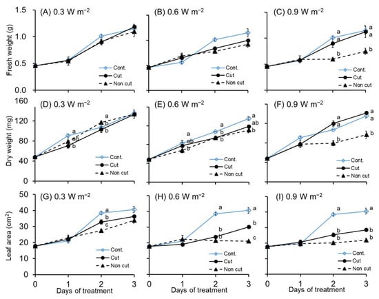 Effects of UV irradiation with or without 300 nm short-cut filters on fresh weight (A–C), dry weight (D–F), and leaf area (G–I) of the third leaf for 0–3 days of treatment. (A,D,G) indicated 0.3 W m−2; (B,E,H) indicated 0.6 W m−2; (C,F,I) indicated 0.9 W m−2. The UV irradiation intensity was set at 0.3, 0.6, and 0.9 W m−2. The vertical bars indicate SE (n = 3–6). Different letters indicate significant differences among the treatments at p < 0.05 by Tukey–Kramer’s test.