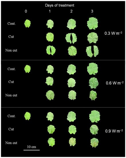 The stem and underside of the leaf turned purple and the upper side of the leaf of UV-treated plants became glossy with increased UV-B irradiation intensity. The upper sides of the 0.3 and 0.6 W m−2 treated leaves became glossier, and the color of the leaves darkened compared to the control as the duration of UV irradiation increased. Generally, UV-B irradiation induces the accumulation of UV-absorbing compounds, such as anthocyanins, in the epidermal cells of leaves [55]. In this study, the concentration of anthocyanins increased as a protective response to UV irradiation. On the other hand, the photosynthetic rate can also be inhibited due to the small stomatal opening and low density as well as by the reduction in the chlorophyll or by a reduction in stomatal conductance of leaves [56,57]. Chlorophyll helps to capture a higher amount of light and convert absorbed light into photosynthetic electron transport, which increases the chances of photosynthesis [58]. UV-B irradiation has been reported to reduce the photosynthetic rate by causing degradation of photosystem (PS) II and structural damage to chloroplasts [59,60]. This tendency was more pronounced following exposure to high UV irradiation intensity. According to Sztatelman et al. [61], high UV-B doses causes chlorophyll degradation and induce the expression of genes related to senescence in Arabidopsis thaliana. In our results, the non-cut treated plant leaves turned yellow at 0.9 W m−2. In addition, high doses of UV-B irradiation clearly led to cell death after 3 days [61]. The 0.9 W m−2 non-cut treatment caused very severe damage to the photosynthetic apparatus of the plants. The canola leaves exposed to the 0.9 W m−2 treatment may have turned yellow owing to the elevated expression of senescence-related genes.