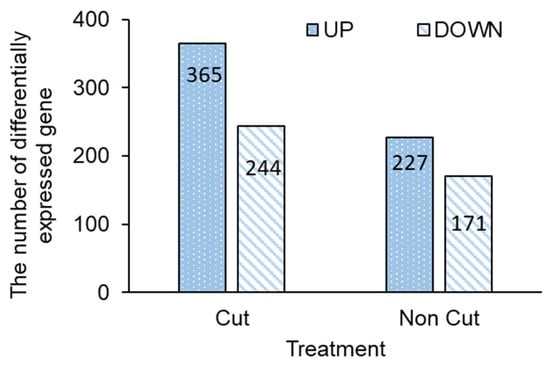 DEGs were analyzed using microarray data. The noise was excluded to evaluate the reliability of microarray data (signal evaluation). The samples were used for analysis, using only clearly detected signals. DEG analysis relied on data that had been verified for GO function. DEGs were calculated based on the Log2 ratio of the cut and non-cut treatments. The result was shown as the numbers of upregulated and downregulated genes.