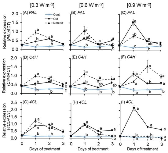 Gene expression of PAL (A–C), C4H (D–F), and 4CL (G–I) mRNA in the third leaf (n = 3). The UV irradiation intensity was set at 0.3, 0.6, and 0.9 W m−2. The vertical bars indicate SE (n = 3). Different letters indicate significant differences among treatments in each UV irradiation intensity at p < 0.05 by Tukey–Kramer’s test.