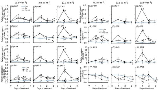 Gene expression of PAL (A–C); C4H (D–F); 4CL (G–I); FLS (J–L); F3’H (M–O); DFR (P–R); ANS (S–U); ANR (V–X) mRNA in the third leaf (n = 3). UV irradiation intensities were set at 0.3, 0.6, and 0.9 W m−2. The vertical bars indicate SE (n = 3). Different letters indicate significant differences among treatments in each UV irradiation intensity at p < 0.05 by Tukey–Kramer’s test.
