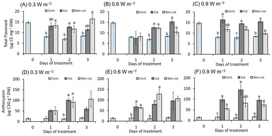 Total flavonoid (A–C) and anthocyanin concentration (D–F) of the third leaf of canola plant. (A,D) indicate 0.3 W m−2; (B,E) indicate 0.6 W m−2; (C,F) indicate 0.9 W m−2. The UV irradiation intensity was set at 0.3, 0.6, and 0.9 W m−2. The vertical bars indicate SE (n = 3). Different letters indicate significant differences among treatments at p < 0.05 by Tukey–Kramer’s test.