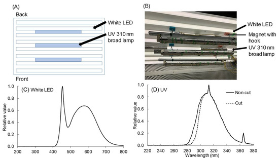 Schematic of plan of the lighting lack (A) and image used for this experiment (B). Spectral radiant flux distribution of white LEDs (LDL40S-N/19/21, Panasonic Co., Ltd.) (C) and UV irradiation with or without 300 nm short-cut filters between 220 and 380 nm (D). Irradiation energy was measured using a spectroradiometer (USR-45DA, Ushio Inc., Tokyo, Japan).