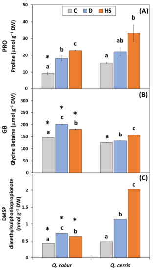 Changes in: (A) proline (PRO; μmol g−1 DW); (B) glycine betaine (GB; μmol g−1 DW); and (C) dimethylsulphoniopropionate (DMSP; nmol g−1 DW) content in leaves of Quercus robur and Q. cerris. Treatments: C: control plants under well-watered soil conditions to maintain SWC (Soil Water Content) in the range of 32–38% and daily air temperature of 25–28 °C; D: drought-stressed plants by withholding soil water for 12 days until the SWC reached values of ca. 9–11%; HS: heat-stressed plants after 6-days exposure to daily temperatures ranging between 33–47 °C. Different lowercase letters indicate significant differences among treatments within each species, while asterisks indicate significant differences between the two oak species within each treatment after one-way ANOVA with Tukey’s honestly significant difference (HSD) post hoc test (p ≤ 0.05). Data represent the mean ± standard deviation.