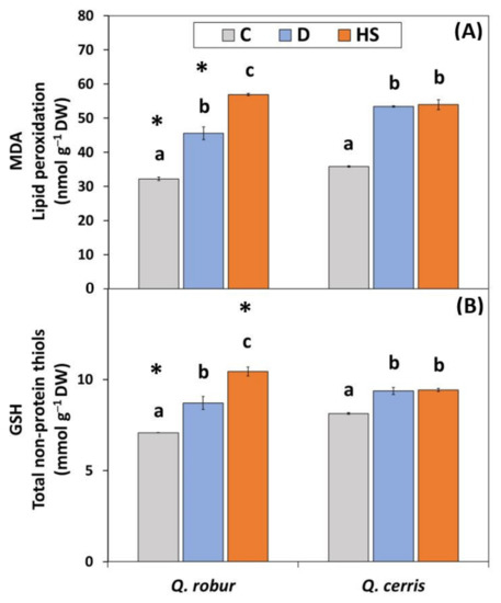 In both oak species, the concomitant and highly correlated increase of foliar MDA and total non-protein thiols (i.e., GSH) under the applied stress conditions can be considered indirect evidence of plant activation of antioxidant responses as previously found in these species (Table 1). However, the induction of individual constituents of the antioxidant system can differ depending on species [79,80] as previously shown in oaks [36,44,45,81] also at molecular level [82].