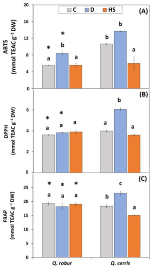 Total antioxidant capacity (mmol TEAC g−1 DW) measured by: (A) ABTS; (B) DPPH; and (C) FRAP assay in leaves of Q. robur and Q. cerris. Abbreviations of the treatments, mean separation, and statistical treatments are as shown in Figure 1. Data represent the mean ± standard deviation.