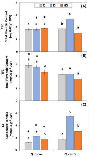 When plants were exposed to high air temperatures, a species-specific response of tannins was evident and similar to that observed under soil water deficit, with Q. cerris exhibiting a higher responsiveness of these antioxidants to both stress conditions than Q. robur. Drought- and heat-induced increasing patterns of foliar tannins have been found in other woody species under stress conditions [83], and our findings confirm that leaf content of tannins is highly species-dependent [84]. Similar to the detected changes of specific osmolytes, we cannot exclude that composition or single metabolites belonging to the classes of phenolics, tannins, or flavonoids respond differently to the imposed stress conditions, depending on species. In addition, we are aware that the analysis of the enzymatic component would provide a more robust understanding of the differential role of the antioxidant machinery in stress tolerance of both Quercus species to each specific environmental stressor.